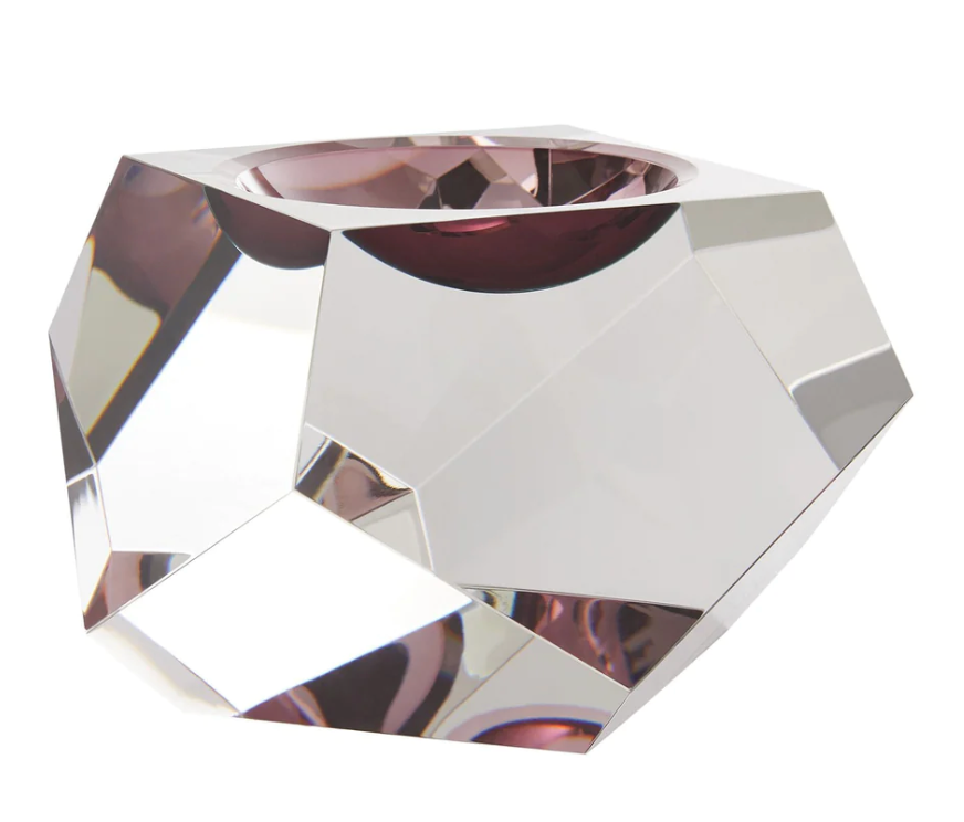Brilliant and refined, the cut crystal of this bowl catches the eye with sparkled light in an orchid hue. The multi-faceted design reflects light and creates depth, while the faceted center adds an element of surprise. The bowl is shallow, for a catchall of small items or on its own as a brilliant accent.